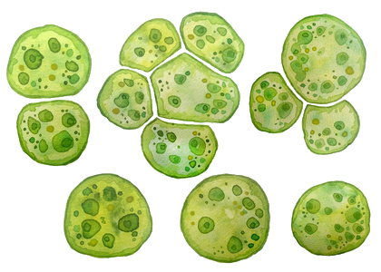 小球藻為單細胞藻類,常單生,也有多細胞聚集。細胞球形、橢圓形內有一個周生、杯狀或片狀的色素體。無性繁殖,每個細胞可以產生2、48或16個似親孢子,成熟時母細胞破裂,孢子逸出,長大后即為新個體。細胞內的蛋白質、脂肪和碳水化合物含量都很高,又有多種維生素,可食用和作為餌料。含有人體所需要的多種營養素。可起到改善平衡體質、補充全面營養、排毒、調節免疫、修復受損細胞等作用。